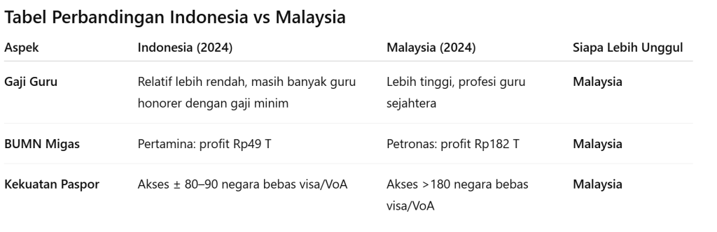 Beberapa indikator menunjukkan Malaysia unggul dalam aspek kesejahteraan. Mari kita lihat tiga contoh konkret: gaji guru, keuntungan BUMN migas, dan kekuatan paspor.