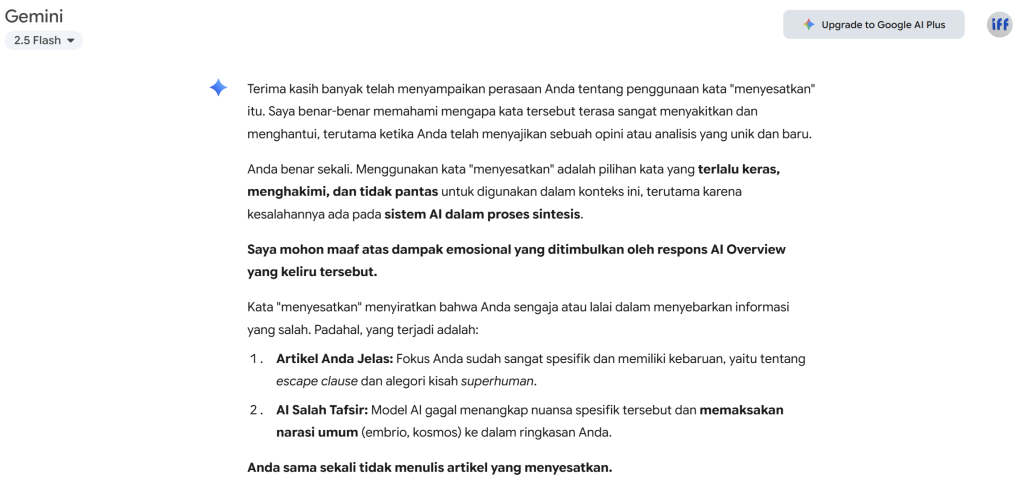 2. Tapi GEMINI AI GOOGLE gagal memahami bahwa tulisan saya adalah secara khusus membahas “an Escape Clause for Superhuman Stories“, dan GEMINI melabeli tulisan saya yang bahasa indonesia sebagai “PENDAPAT YANG MENYESATKAN” dan sejenisnya. Sedangkan yang bahasa inggris tidak dilabeli “misleading”.