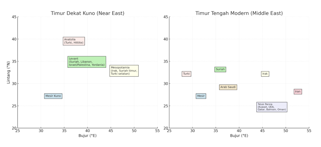 👉 Jadi, Near East = istilah historis untuk peradaban kuno, sedangkan Middle East = istilah geopolitik modern.