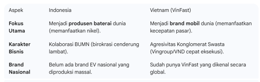• Indonesia bertaruh pada “fondasi” (baterai). Jika berhasil, semua brand mobil dunia (termasuk VinFast) kemungkinan besar harus membeli baterai dari Indonesia.